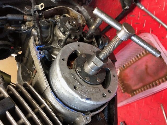 Il y a eut une forte consommation de joint bleu pour remonter le carter d'allumage pour éviter les fuites d'essence :) Et il est préférable de prendre un extracteur pour sortir le volant moteur plutôt que les coups de marteaux qui ont été mis sur ce pauvre volant moteur.